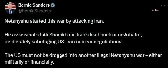“Netanyahu bu savaşı İran’a saldırarak başlattı. İran’ın baş nükleer müzakerecisi Ali Shamkhani’yi öldürerek ABD-İran nükleer müzakerelerini taammüden sabote etti. ABD, Netanyahu’nun bir öteki yasadışı savaşına askeri ya da mali olarak sürüklenmemelidir.”