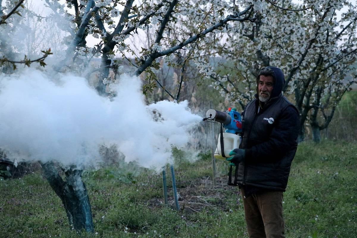 Meyve yetiştiricileri, sisleme makinesiyle eserlerini muhafazaya çalıştı.