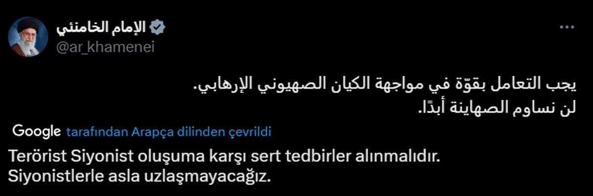 Yaptığı konuşmada, İsrail’le rastgele bir uzlaşının kelam konusu olamayacağını lisana getiren Hamaney, “Terörist Siyonist varlıkla güçlü biçimde hesaplaşılmalı. Onlarla asla uzlaşmayacağız” sözlerini kullandı.