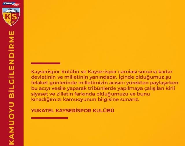 Devlet Bahçeli’nin davetinin akabinde Muhteşem Lig grubu Kayserispor, Kayserispor topluluğunun devletin ve milletin sonuna kadar yanında olduğunu, şu felaket günlerinde ulusal acımızı yürekten paylaştığını, tribünlere hakim olmaya çalışan kirli siyaset ve zillete de karşı olduğunu ve bunu da kınadığımızı kamuoyunun bilgisine sunarız” açıklaması paylaştı.