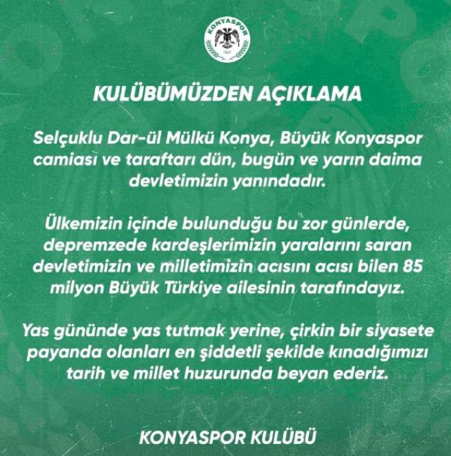 “Selçuklu Dar-ül Mülkü Konya, Büyük Konyaspor topluluğu ve taraftarı dün, bugün ve yarın hep devletimizin yanındadır. Ülkemizin içinde bulunduğu bu sıkıntı günlerde, depremzede kardeşlerimizin yaralarını saran devletimizin ve milletimizin acısını acısı bilen 85 milyon Büyük Türkiye ailesinin tarafındayız. Yas gününde yas tutmak yerine, berbat bir siyasete payanda olanları en şiddetli biçimde kınadığımızı tarih ve millet huzurunda beyan ederiz.”