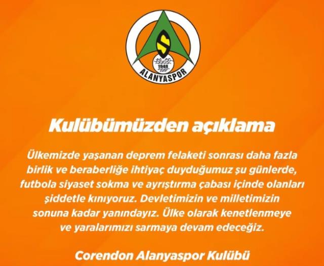 “Ülkemizde yaşanan zelzele felaketi sonrası daha fazla birlik ve beraberliğe muhtaçlık duyduğumuz şu günlerde, futbola siyaset sokma ve ayrıştırma gayreti içinde olanları şiddetle kınıyoruz. Devletimizin ve milletimizin sonuna kadar yanındayız. Ülke olarak kenetlenmeye ve yaralarımızı sarmaya devam edeceğiz.”