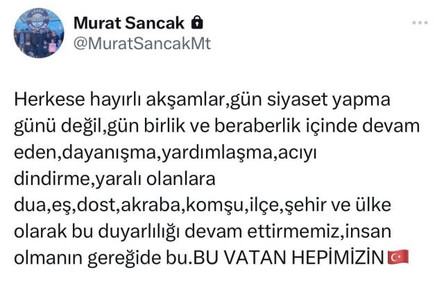 “Gün siyaset yapma günü değil, gün birlik ve beraberlik içinde devam eden dayanışma, yardımlaşma, acıyı dindirme, yaralı olanlara dua, eş, dost, akraba, komşu, ilçe kent ve ülke olarak bu hassaslığı devam ettirmeliyiz, insan olmanın gereği de bu. Bu vatan hepimizin.”