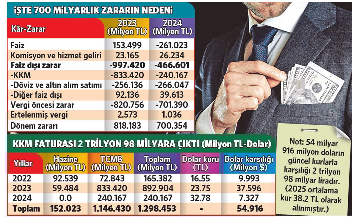 Raporda yer alan bilgilere nazaran, Merkez Bankası’nın 2024 yılında uğradığı 700 milyar 354 milyon liralık devasa ziyanının 240 milyar 167 milyon lirası KKM ödemelerinden, 266 milyar 47 milyon lirası döviz ve altın alım satım ziyanından, 261 milyar lirası da faiz ziyanından kaynaklandı. Merkez kurul ve hizmetlerden elde ettiği 26.3 milyarlık karla 2024 ziyanını 700.3 milyarda kapatmış oldu.