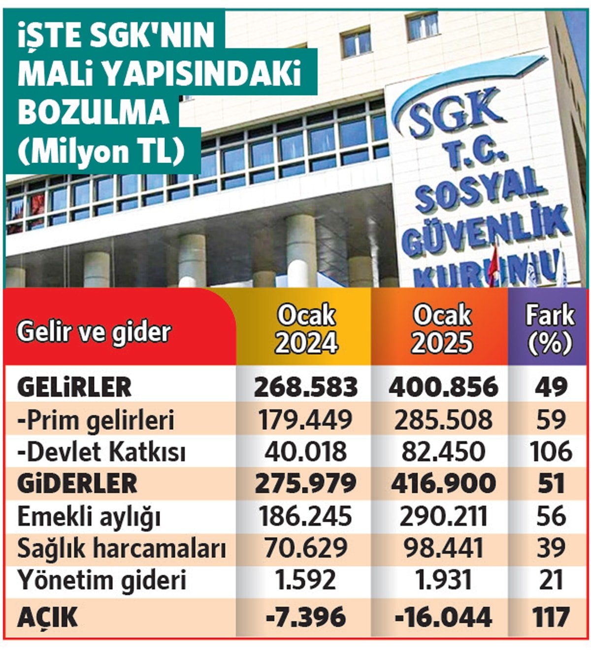 SGK bu yılın ocak ayında 401 milyar liralık gelire karşılık 416.7 milyar liralık masraf yapınca ortaya 16 milyar 44 milyon liralık devasa açık sayısı çıktı. Geçen yılın ocak ayında 7.4 milyar lira açık veren SGK’nın aylık açığı bir yılda yüzde 117 oranında, başka bir tabirle yaklaşık 2.2 kat arttı.