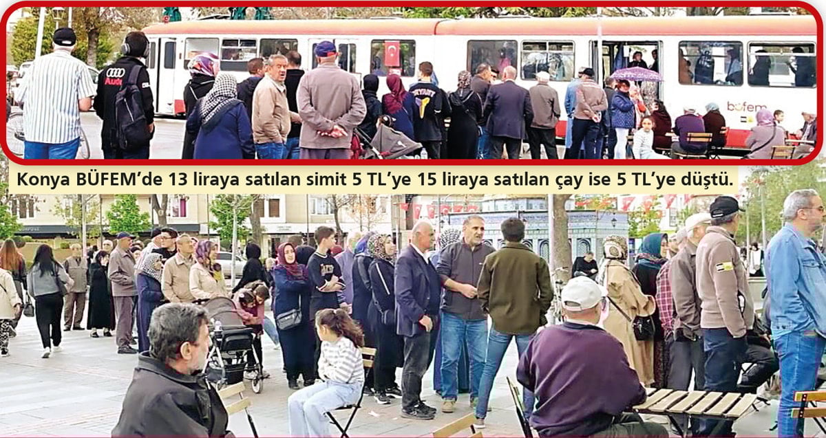 AKP’li Konya Büyükşehir Belediyesi’ne ilişkin BÜFEM’de kentte 13 liraya satılan simidin 5 liradan 15 liraya satılan çayın da 5 liradan satışa sunulması metrelerce uzun kuyruğa neden oldu. Sabah saatlerinde başlayan uzun kuyruklara öğle saatlerinde başlayan yağmur da mahzur olmadı.