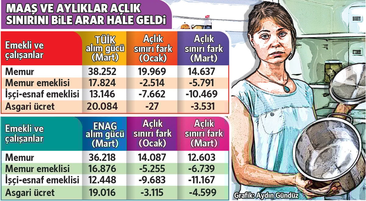 2024’ün sonunda taban fiyatlı açlık sonunun 4 bin 81 lira, en düşük işçi-esnaf emeklisi 8 bin 583 lira ve en düşük memur emeklisi de 3 bin 496 lira daha altında gelire sahipti. İktidar bu yılın başında, ‘merak etmeyin enflasyon düşecek’ diyerek hedeflediği hayali enflasyona nazaran artırım yapınca minimum fiyat açlık hududunu geçemediği üzere 27 lira altında kaldı. Tıpkı biçimde en düşük işçi-esnaf emeklisinin aylığı yeni yıla açlık hududunun 7 bin 662 lira, memur emeklisinin aylığı da 2 bin 514 lira altında girdi. Mart sonuna gelindiğinde ise taban fiyatın alım gücü Türkiye İstatistik Kurumu (TÜİK) enflasyonuna nazaran 20 bin 84 liraya, Enflasyon Araştırma Kümesi (ENAG) enflasyonuna nazaran 19 bin 16 liraya gerilerken açlık sonu 23 bin 615 liraya çıktı. Milyonlarca minimum fiyatlı açlık sonunun 3 bin 531 TL ile 4 bin 599 lira altında kaldı.